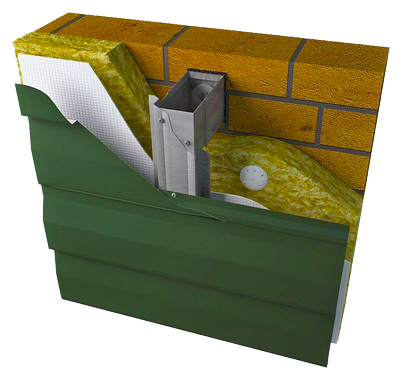 Профнастил - это профилированные листы металла окрашенные в цвет, на которые нанесены сечения волнистой или трапециевидной формы. Установка профнастила на фасад происходит с помощью специальной фасадной системы состоящей из кронштейнов и направляющих, скрепляющихся между собой заклепками и прикрепленных к стене здания с помощью специальных фасадных анкеров. Данный вид облицовки можно использовать как с учетом утепления базальтовыми плитами так и без него.